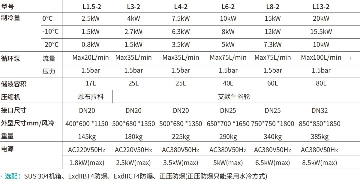 型號制冷量循環(huán)泵儲液容積壓縮機接口尺寸外型尺寸mm/風冷重量電源